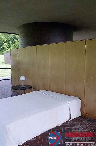 菲利普·约翰逊在玻璃屋前 与女人的范斯沃斯室第(Farnsworth House)不合,菲利普·约翰逊的房子是对称并且坚毅地坐落在地面上的,四分之一英寸厚的玻璃墙悉数由黑色钢柱支持。内部空间被低矮的胡桃木橱柜与砖砌圆柱体分别,圆柱体内为浴室和卫生间。砖砌的圆柱体和地板颠末抛光措置,泛出深邃深挚的紫色。因为业主就是计划者本人,这个室第在而后也不想范斯沃斯室第那样经历曲折。