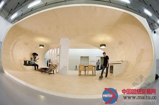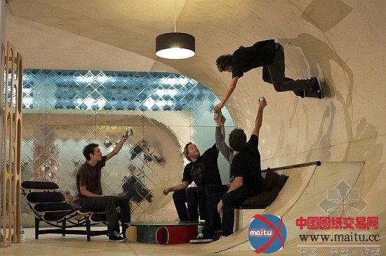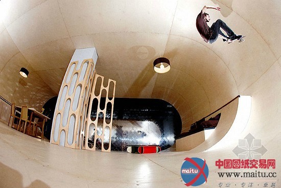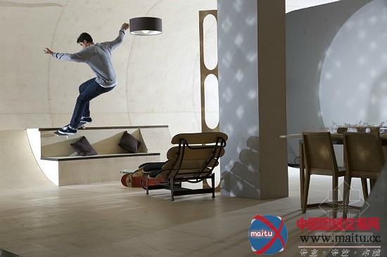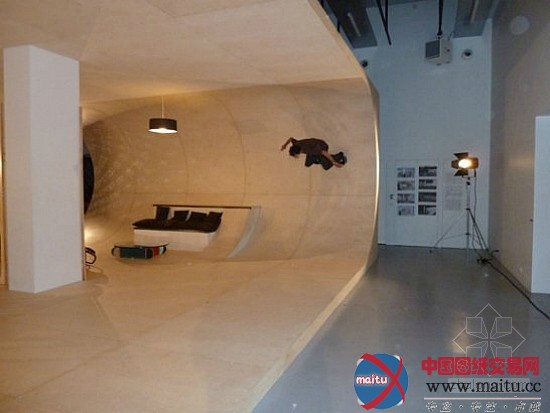 这个公寓最奇特的地方,就在于此中的滑板。从内部到外部,流畅的曲线计划,从地面到墙壁乃至天花板构成的连续的外不雅为滑板欢愉爱好者供应了不小的便利。这个计划来自于弗朗索瓦佩兰和Gil Lebon Delapointe。计划把公寓分别成三个独立的家庭空间,第一空间包含了客堂、用餐区和厨房,第二空间则包含一间寝室和浴室,而第三空间则美满是滑板练习区。这个计划从某种意义上说其初创性在于制作了一个非欧几里德多少空间与连续面,更流畅的动态反应出了21世纪的糊口体例。