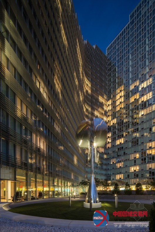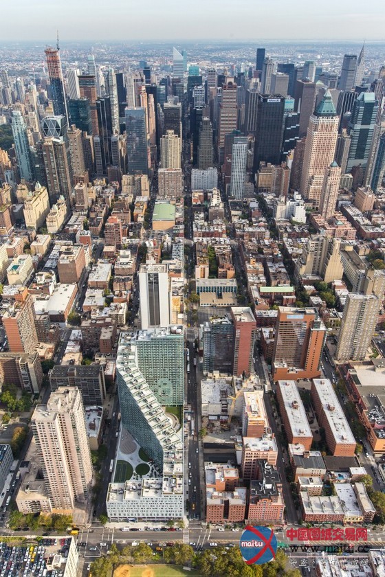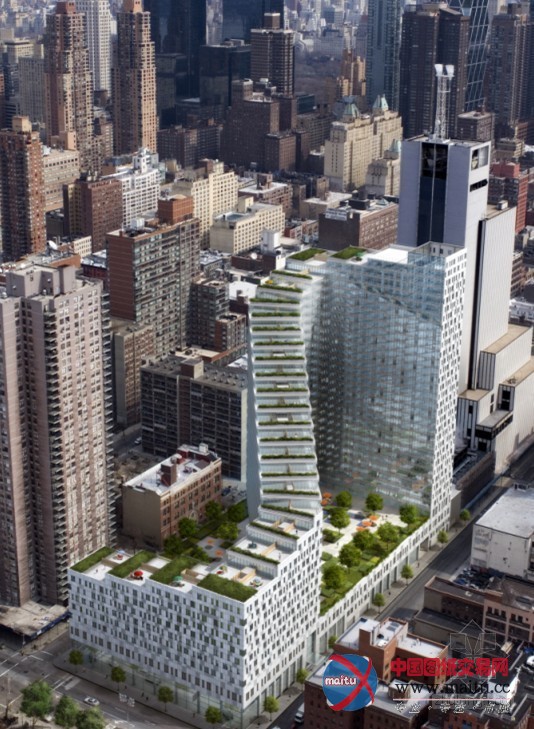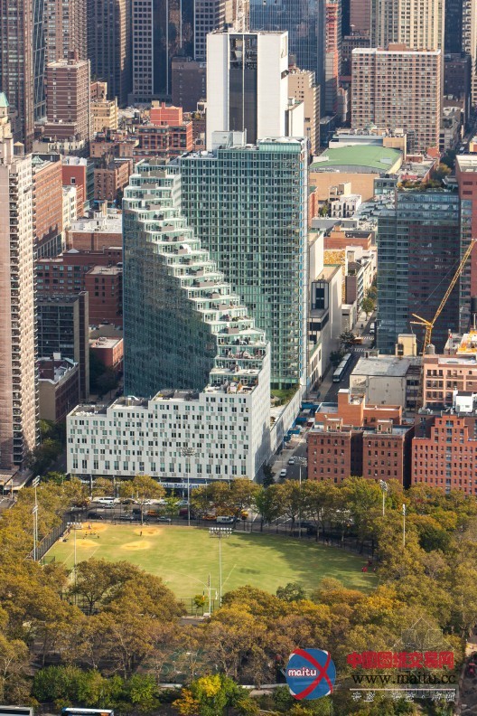 建筑在底层部门调集了多种商业用处的空间,并供给27层的栖身空间。底层建筑包含一个5109.66平方米的汽车摆设室,朝向11大年夜道。下面是一个25548.33平方米的办事空间。一个3437平方米的空间作为社区和一个小的零售空间利用。项目还包含一个2601平方米的建狼俱乐部和可停靠200辆车的泊车空间。整座建筑共创作发现了865个单位(695个出租单位,和170个公寓单位)包含20%在内的住房。项目整体倾斜,远离德威特克林顿公园,开端沿着11大年夜道26米的处所建造,然后爬升到建筑物中间的100米处。这个高度成功的将两个很是不合的城市尺度转型成功。公寓在11大年夜道以西的公园处,与该地区东边的无线德律风互换塔相垂直。如许的设计使尽大年夜大都的公寓获得了天然光照和通风。双层走廊使全部地区的视角对准了曼哈顿市区,削减了周边建筑物的遮挡。建筑物的镜像布局向我们揭示了两个院子,南边一个日光混堂花圃,北边一个阴凉勾当区。