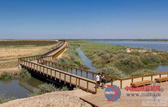 塔霍滨河带状公园 塔霍滨河带状公园由两部分组成:位于沙滩海畔的独立多功能区“垂钓海滩”(PRAIA DOS PESCADORES),以及与泥土路、海岸(溪流和排水渠)相连、源自城区和自然区,最终汇聚至垂钓海滩的的6km长人形步道。海滩和自然区域之间由700m长拔高的木质小道连接起来,沿着小道可以通向由运货的旧托盘建立的观鸟站。