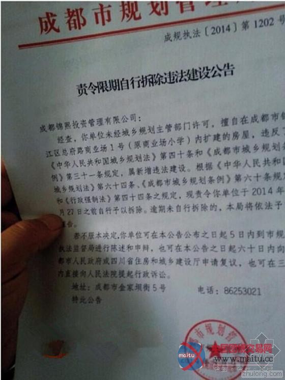 市规划局下发的责令拆除公告 市民举报:商家违章搭建 “规划部门已经认定为违章搭建了,但还在施工。”昨日,成都市民周先生举报称,春熙路商圈商业场区域(原商业场小学)正在进行违章扩建,新增面积上千平米,且不顾规划部门的整改要求,仍继续施工。 周先生称,该原有建筑与周边建筑之间留有消防通道,不过,目前该区域的消防通道已被新增搭建占去大半,“如果遇到紧急情况,消防车根本进不来,有很大的安全隐患。另外,在施工期间遇到降雨,也因施工导致排水不畅,严重影响了周边商户。” 昨日,记者在现场看到,不少工人正在进行施工,这栋5层大楼外从1楼到5楼,均装上了钢材骨架,且每层扩建的楼面已经浇筑了混泥土,与原有楼面形成一个平面整体。整栋建筑外观与施工前相比,发生了较大变化。 记者了解到,大楼产权属成都锦江房地产(集团)有限公司所有,现已租赁给成都锦熙投资管理有限公司使用。目前,该公司正对大楼进行装修开发。 市规划局:未获规划许可 属违法建设 那么,该栋大楼的新增面积到底有多大,是否如市民所言属于违章建筑呢?记者来到成都市规划管理局进行了求证。 据该局负责锦江区违法建设查处工作的负责人顾先生介绍,位于锦江区总府路商业场1号(原商业场小学)内扩建的房屋属新增违法建设。不过,新增违法扩建面积并非如市民所言达到上千平方米,“经过我们实测,有700多平米左右。” 顾先生介绍,该建筑周边有多位商家对违法建设者进行了举报。接到举报后,规划执法人员也随即到现场进行了勘查认定,同时做了面积实测。随后,对违法建设者成都锦熙投资管理有限公司下发了调查通知并要求停止施工。 “在调查时,对方(施工单位)不能提供相关的施工许可。”顾先生介绍,成都锦熙投资管理有限公司未取得建设工程规划许可证,且无房产证等必备手续,因此违反了相关法律,故认定其行为系违法建设。 2次被叫停 至今仍在施工 记者在成都市规划管理局采访时,顾先生向记者出示了两份公告。 顾先生介绍,在接到市民举报进行现场查看后,成都市规划管理局于2014年4月14日对成都锦熙投资管理有限公司下发通告要求其暂停施工,并要求其准备相关手续接受调查。但对方未能提供。2014年5月9日,成都市规划管理局再次对该公司下达了责令限期整改的决定书和公告。 记者从公告上看到,“经查,你单位未经城乡规划主管部门许可,擅自在锦江区总府路商业场1号(原商业场小学)内扩建的房屋,违反了《中华人民共和国城乡规划法》第四十条和《成都市城乡规划条例》第三十一条规定,属新增违法建设。”同时,公告责令其于5月27日之前自行予以拆除。 不过,截至今(11)日,记者看到,违法新增区域依旧未进行拆除。同时,大楼一旁又新建起近200平方米的三层建筑物钢架,其他区域也正在施工。 对此,顾先生称,如商家仍然不进行拆除,将依据相关法律规定,在自公告下发后3个月即2014年8月9日对其实施强拆。 |