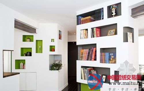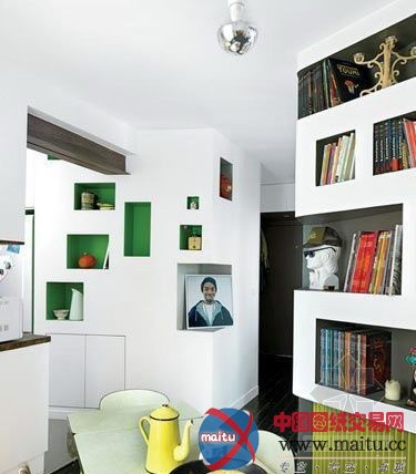 这是一个巴黎的漫画收躲夹的公寓,是由闻名的法国计划事情室H2OArchitects计划的。公寓内部面积为60平方米。房子里有许多白色的圆形墙壁,墙壁上放有各种范例的漫画书,同时浴室,储存室和一些家具也隐躲在墙壁中。
