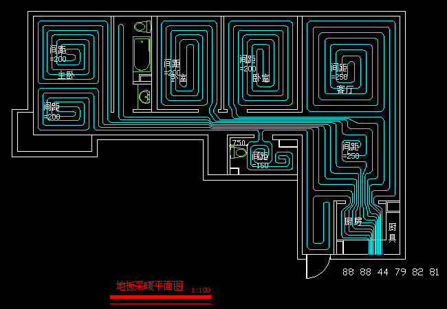 图纸摘要:地暖系统边距均按200MM,边墙均采用防护处理。地暖系统设计功率为80W/平方米,局部按180W/平方米。...