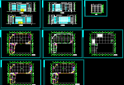 图纸摘要:某厂区办公楼设计:四层框架结构,图纸内容包括各层平面图、立面图、剖面图、楼梯详图、门窗详图及...