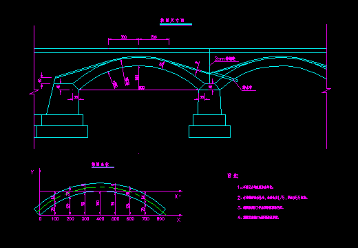 图纸摘要:石拱桥剖面、总体图,拱圈尺寸、拱圈坐标图...