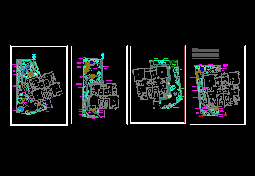 图纸摘要:四个别墅外环境设计方案,强调了前院的开敞与大气,方便住户日常进出的交通需要。庭院中部用丰富的...
