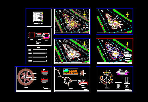 图纸摘要:道路交叉口交通岛绿化设计,内容包括苗木表、绿化平面图、竖向设计图、种植设计图、照明、给水设计...