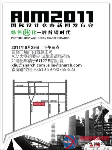 媒体支持:《修建技艺》《Mark》《domus》《视觉联盟》《中华修建报》《北京青年报》《今日北京》《都会环境计划》《胜利》《新地产》《修建创作》《Abitare》 收集支持:搜房网,筑龙网 活动当日流程: 14:30 -15:00 佳宾参加,签到 15:00 -15:10 开场,主持人致开场辞并介绍参加佳宾 15:10 -15:30 AIM组委会主席发言 关于AIM及2010AIM大年夜赛回顾 介绍本届2011AIM(topic、jury) 15:30 -16:10 佳宾论坛—— 主题:后首钢期间 首钢代表介绍二通汗青和近况 16:10-16:15 启动典礼 16:15-16:30 答记者问 16:30 宣布结束,安排后续参不雅 16: 30-17: 00 媒体参不雅首钢