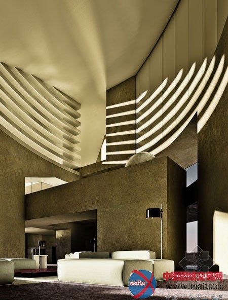 从凌晨到傍晚,空间感在赓续转变,起居室中曲折的断绝壁在中午遮挡住了光芒,而厚重的墙面上切割的梯形浮泛又让光芒穿越。到了傍晚,大年夜厅暗淡下往,穹顶却犹如火盆一样熠熠生辉。石块、水泥和紫色让这座单体修建充满了不成预知的转变。