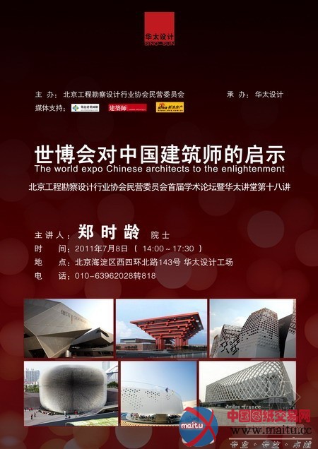 2011年7月8日下战书,由北京工程勘察计划行业协会夷易近营事情委员会主理、华太计划承办的首届学术集会将在华太计划工厂召开,主题为“世博会对中国修建师的启迪”。集会特邀中国工程院院士、上海世博会主题演绎参谋、同济大年夜学传授郑时龄,与多位北京地区修建专家,就修建与文化的干系、世博会反应出的中国修建文化思惟、后代博的上海修建等话题举行会商。