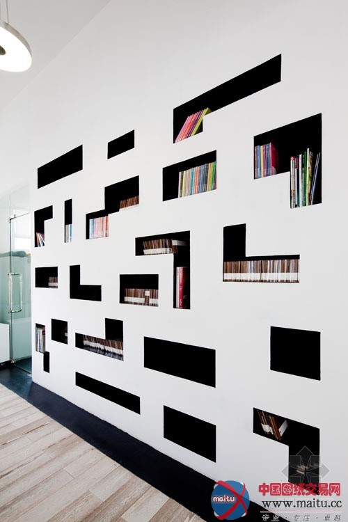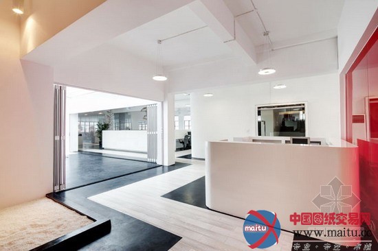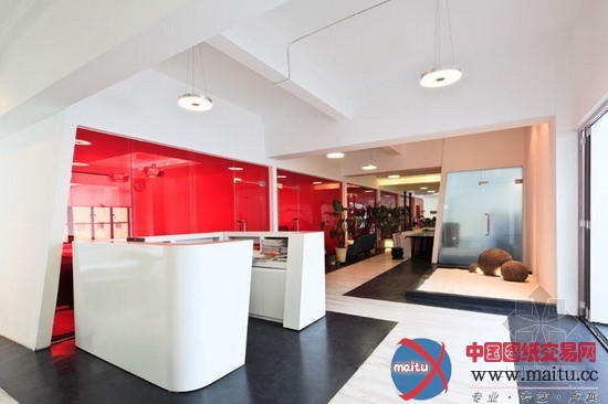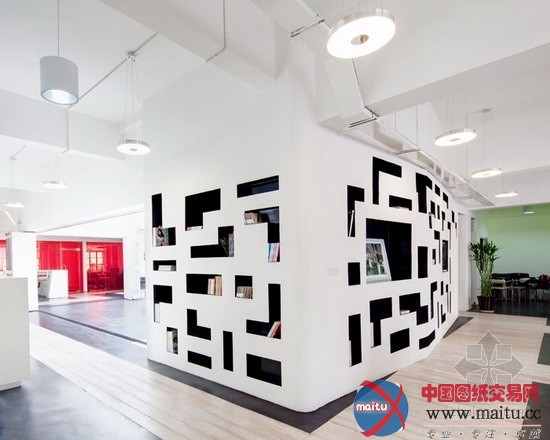 开放式事情区配备了大年夜型白色钢琴漆办公桌,知足了友好的事情氛围并使员工交换起来更轻松。配色计划也仍然大年夜面积选用纯净的白色。而集会室的玻璃门选用了赤色以均衡并冲破白色的单调。一样,在藏书楼区,几组暗色调多少型书架连续了猛烈的画面感和视觉元素。