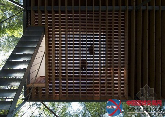 “丛林空中别墅”经由过程一系列柱子与横条肋板支持,房子被抬到6.5米高空,为栖身者供应了与树冠平齐的不雅景角度,同时可以不雅赏到远处的山川美景。架空布局底部构成开放式小庭院,小院被树木围困,构成一道天然的屏风,微天色宜人。