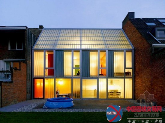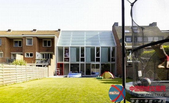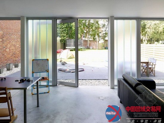 dmvA architecten在庭院立面上采取了半透明材料。巨大年夜的落地玻璃门让室内空间可以耽误到户外庭院中。这类半透明措置为内部空间供应了雄厚的天然采光,同时将室表里的氛围畅通领悟在一体。在平面布局上,栖身空间安插在庭院一侧,包含起居室、餐厅、厨房、寝室等,而别的的办事功效则安插在临街一侧。