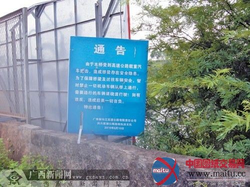往年8月,该桥被高速公路上的超高货车碰撞而呈现安然隐患,有关部门在桥的两端,各立了一块布告牌,制止统统灵活车辆从桥上通行,“如有背反,造成成果统统高傲”。记者看到,这两块布告牌仍然直立在两端桥头,落款是广西新长江高速公路有限义务公司、兴六高速公路路政法律支队,时候为2010年8月10日。