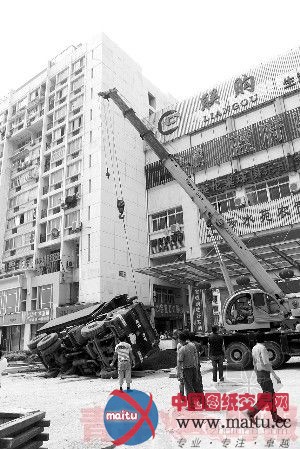 吊起侧翻的工程车昨天中午12点摆布,当时这辆工程车正在倒车,预备卸沥青,没想到,倒着倒着,地面突然开裂塌陷,车轮陷了进往
