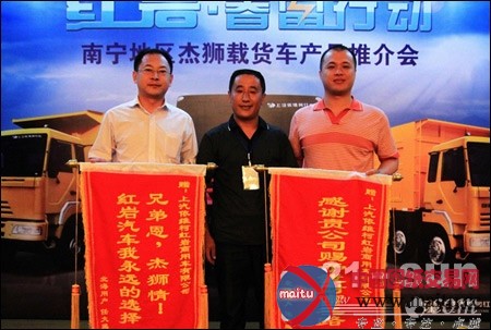 本次推介会另有一名佳宾特意从北海赶来,为公司奉上了感激贵公司赐赉我财产之路”和兄弟恩杰狮情,红岩汽车我永久的选择”两面美丽的锦旗,表达对公司的深挚友谊,代表了公司杰狮重卡在品德上达到的高尺度、在市场上获得的用户的承认和支持。