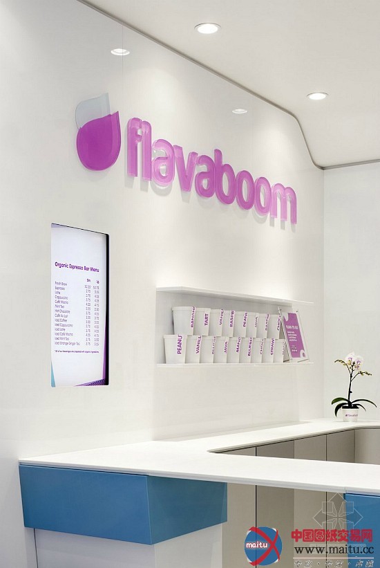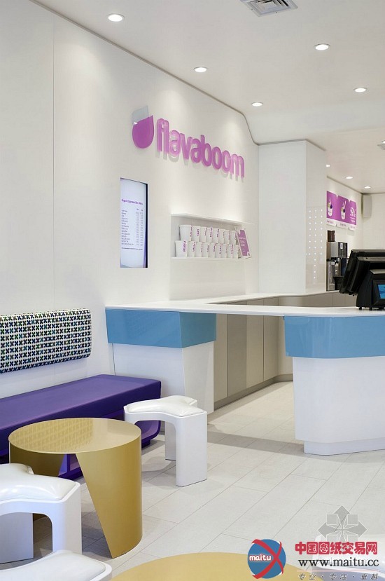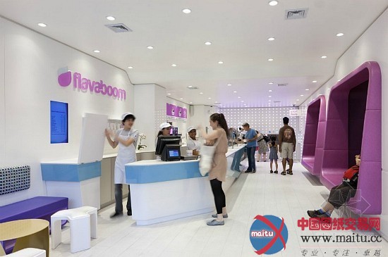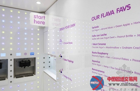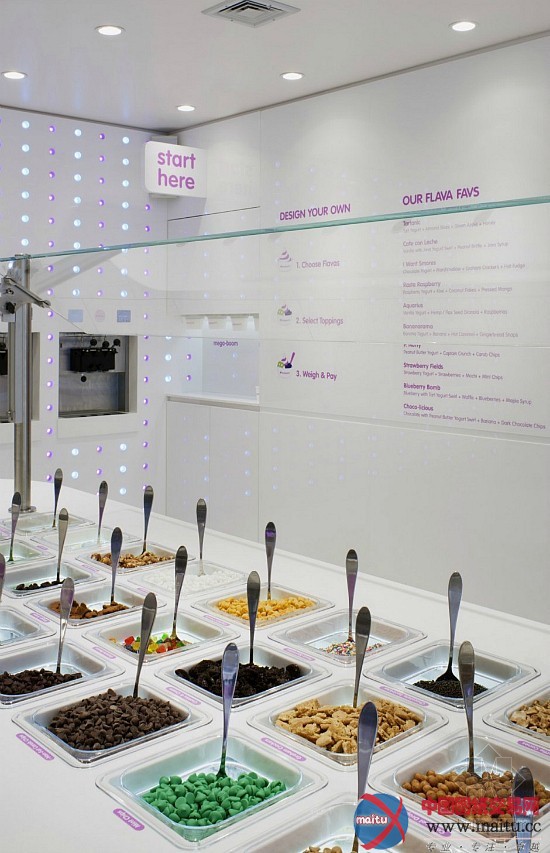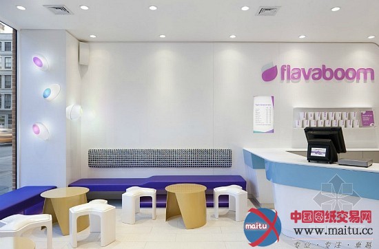 这是一家位于纽约的冰冻酸奶店,这里有一个特别的计划,它连络了尝试室般的计划和功效,,购物者可以手动建立本身奇特的冰雪组合。在充足的通亮色采和LED灯照耀下, Flavaboom将来的发展让人看好。在134平方米的店展中包含了一个 9米长抛光白墙和LED灯。当灯光闪动时,墙壁上构成数百个形态各别的条纹。 该项目标计划者,来自纽约的环保和本地制作的计划公司总裁理查德说:“我们所假想的团体观点就是一块甘旨的调色板,它有着光芒饰面,这是充满活气的标记”。