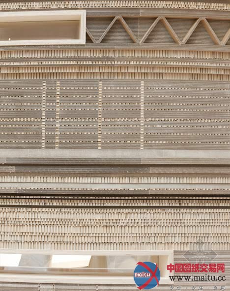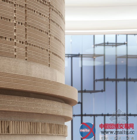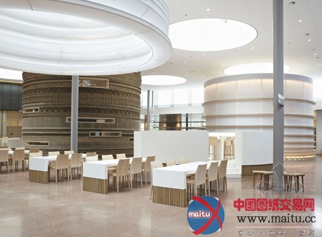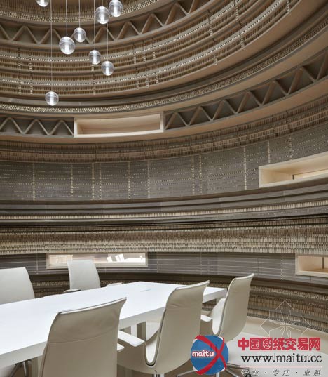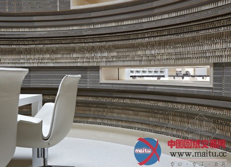 这是荷兰的纸板银行,由阿姆斯特丹事情室Architecten计划完成。其计划悉数用纸板制成,范围包含金融办事参谋地区,和银行总部的集会室。分层的多层纸板上建立一个气缸的外不雅纹理图案。半透明的日本报纸笼盖,和富有弹性的灯笼,环绕着圆形天窗。木料制的家具弥补屏幕周围的敞开式地区。