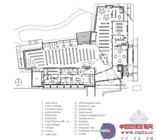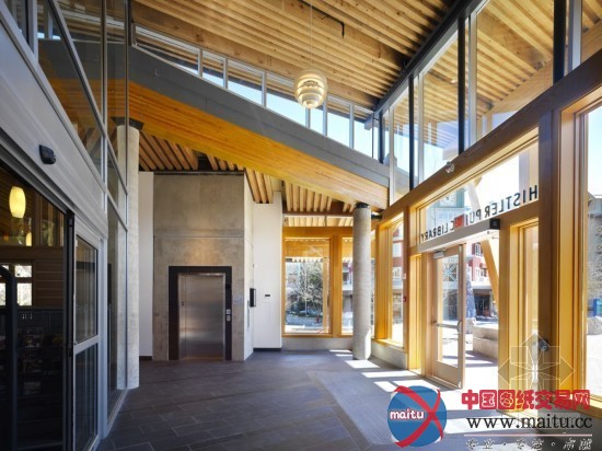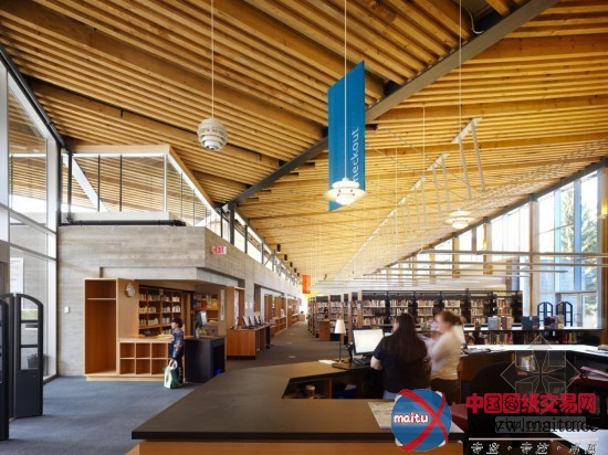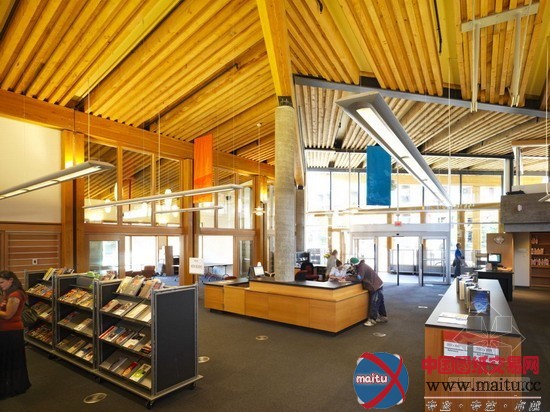 藏书楼面积1.5万平方英尺,呈L型布局。北面靠近公园,是以北立面利用了超大年夜的玻璃幕墙体系,能让人们浏览到公园和远处的山脉风景。为了增能人们和表面环境之间的接洽,垂直的窗框都随机地摆列,人们看到表面树干的时候,感触感染开阔通亮,很舒心。