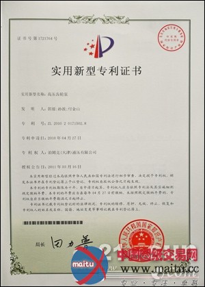2010年11月至2011年3月期间,泊姆克(天津)液压有限公司前后胜利申请齿轮泵外不雅计划专利、高压齿轮泵合用新型专利等7项国度专利。