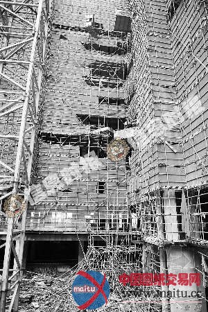 昨日上午现场,坍塌的装卸平台位于“星光联盟LCD”专业市场8楼外墙处,约4平方米大年夜小。大年半夜侧平台已掉落落,一根支持平台重量的钢绳摇扭捏晃地悬在半空中。平台下面,大年夜片脚手架被砸坏,混乱无章地散落于地。脚手架下,还压着一顶施工人员的帽子。