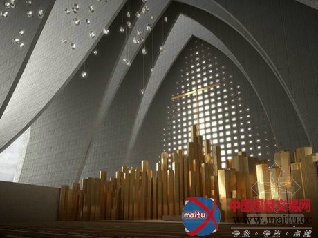 每个折叠拱之间都镶有透明玻璃幕墙,教堂朝向南北开放,室内光芒充足。修建的平面直接插进到基地中,并将“十字形”的布局掩躲鄙人面。指导参不雅者进进教堂的坡道位于混凝土拱的基座上,这类措置为团体空间结果增加了韵律感。