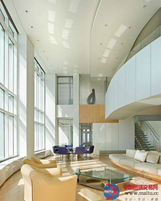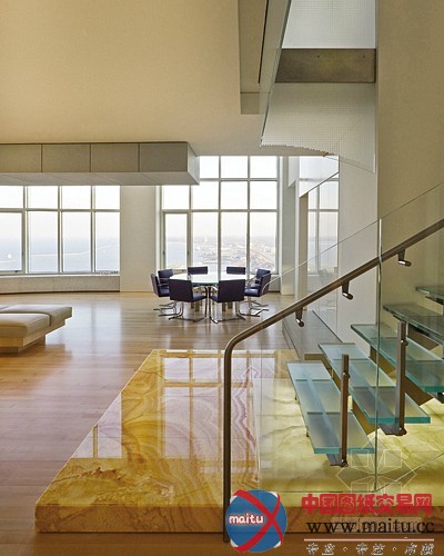 这是SOM计划的米尔沃基室第楼,这个两层楼的复式公寓坐落在密歇根湖旁, 这个4500平方公尺的公寓保持了奇特的视觉空间。 玻璃和不锈钢楼梯连接高低两层,“我们希看楼梯能成为一个雕塑工具”计划者如斯描述他们的设法。玻璃最大年夜限度地提高透明度. 修建师计划的定制喷砂玻璃面板,被用作房距离板。