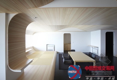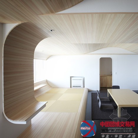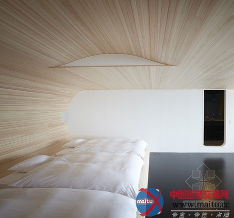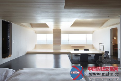 这是位于山形县的蓬莱1111当代化套房。Touhoku大年夜学的门生用起伏的木料板线重修Kameya旅店房间的墙壁和天花板。桧木包装的长条木板,环绕主室建立的床展和面对海景的窗户。窗口下面是木制的一个板凳宁静台。淋浴和盥洗室的一面墙上有一个连接表面风景的进口。
