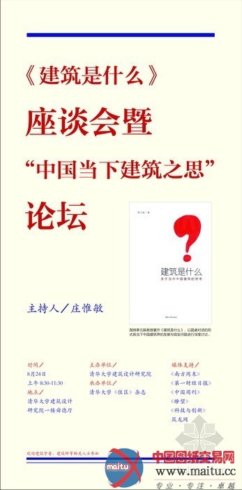 《修建是甚么》座谈会暨“中国当下修建之思”论坛将在8月24日(周三)上午召开,届时,海内多位知名修建计划大年夜师讲齐聚清华大年夜学修建计划研讨院,共同会商中国当下修建界的一些问题。