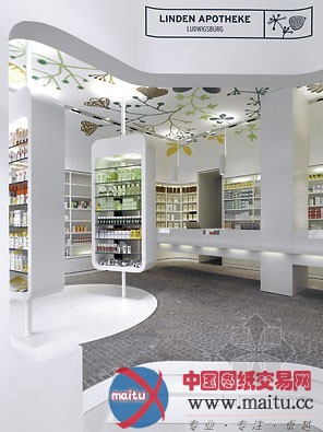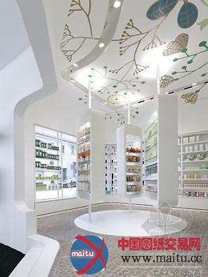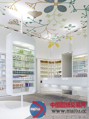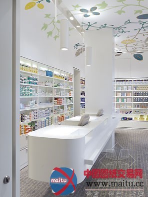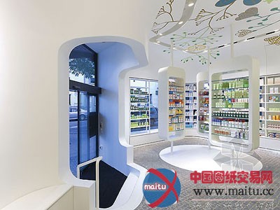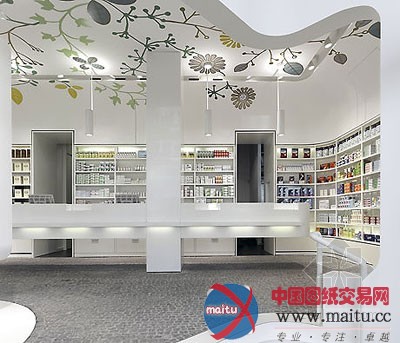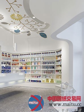 这是一个药店的计划,团体的彩色基调仿佛是药店的特色,这个计划也是如斯,货架上整整齐齐的摆放着各种药品,天花板上的计划让全部空间有一种灵动的感触感染,并且充满了天然的气息,比拟能让每个主顾获得更好的表情。