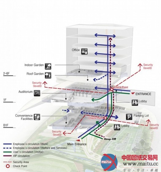 起首,修建最大年夜限度的减少南北走向坡面的减少量,从而计划出立体步行道,并且途径计划考虑到了冬季的东北季风的身分。修建经由过程坡面这个宽阔广大旷达的倾斜地面的计划与利用,使其斜面成了一个两层之间相同得很好的大众平台。修建计划使季风和阳光等可以充分举行畅通和照耀,从而最大年夜限度的减少了能源花费,并且供应了最好的生态环境。