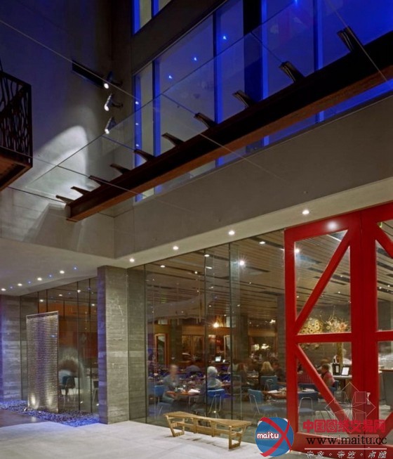 旅店面积32,000平方英尺,拒尽多余的装潢,旅店大年夜厅呈开放式,光滑的混凝地盘板与混凝土板面墙构成一个简便且通风的宽大年夜空间,天花由交织的花旗松拼集而成。地面楼层设有一家餐馆和一个量身定制的镀锌“欢迎酒吧”,这个酒吧既可用作欢迎桌又可用作咖啡/鸡尾酒吧。大年夜厅正门朝向人行道,给本地街道增加一抹亮色。