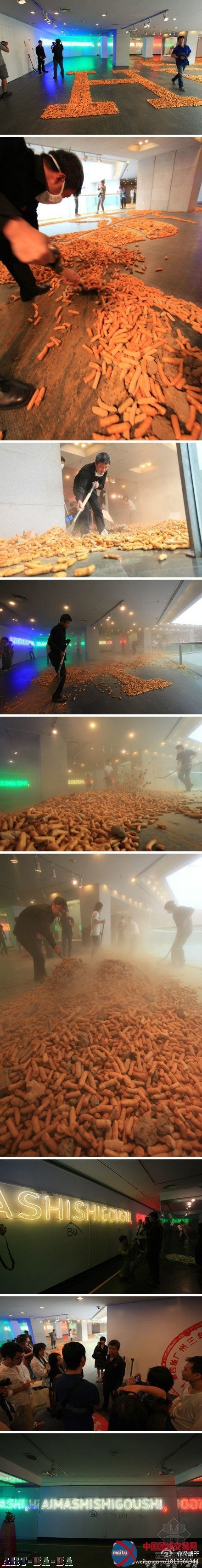 广州艺术家冯峰的作品《金狗屎》特别惹人注视,展厅中一堆金色的狗屎模型,周围则变身高等豪侈品阛阓。一个个玻璃橱窗内摆放着很多豪侈品牌的包包,仔细一看,却又都是盗窟货。冯峰在作品里除嗤笑中国独有的“盗窟”品牌征象,还赤******地嗤笑了豪侈品牌和人的欲看。 但是可巧的是,该品牌本年是广州三年展的援助商,并且专门构造了作品参展。冯峰流露,他曾就本身的作品与援助商有过一番较量。因为他的作品,援助商方面一度流露表现要撤出援助,厥后经主理方倾力调和才作罢。 馆长罗一平解释说,现在美术馆的很多大年夜型展览没法完整杜尽与本钱的胶葛。但此次,引进援助商参展其实不是品牌宣布,而是一个艺术项目“HBOX”的展现。这个项目是在国际上很有影响力,也是商业与艺术文化的一个品牌。