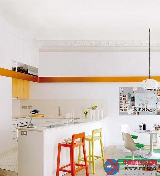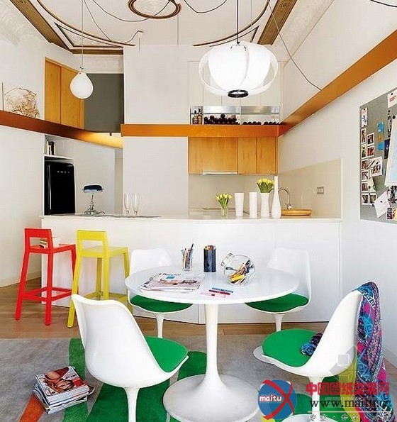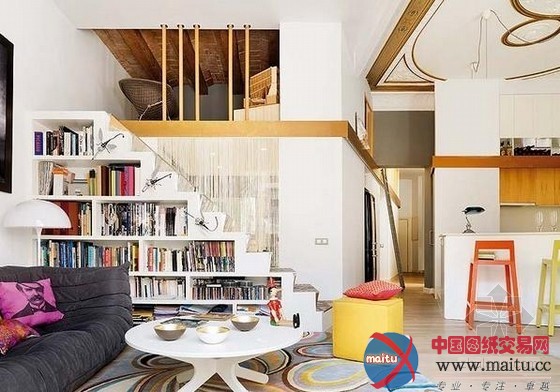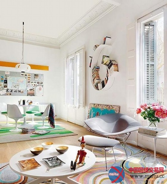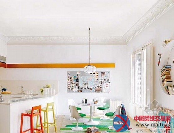 这是一间美的令人梗塞的位于巴塞罗那的公寓,繁复多彩的室内让全部空间跃动起来。纯白的墙壁是举行色采与形状组合,创作发明年青活泼的氛围的尽好背景。开放式的楼层计划容纳了高高的天花和一个夹层,光芒充足、房间亮堂。公寓面积仅为105平米,修建师Miel Arquitectos却胜利打造出一个当代而又传奇的空间,线条、色采、形状与纹理相互交织,使得这个室第空间充满舒服感、创作发明力和活泼性。