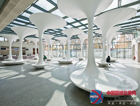 在温馨而宜人的氛围下建立一个明白的总平面及参不雅者流线,从而提高了修建的利用性。在大年夜厅的中心是一个个由玻璃纤维材料制成的多功效家具。这些树一样的举措措施供应了座椅,遮阳和吸声的感化。晚上这些树还会发出白色和蓝色的光装点大年夜厅。树的形状寄意着技术与天然之间的干系,在奇妙的隐躲了厅内的柱子的同时留出了经由过程玻璃天花板看到老修建的视野。