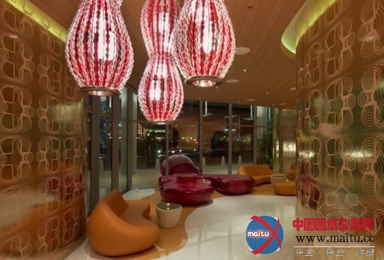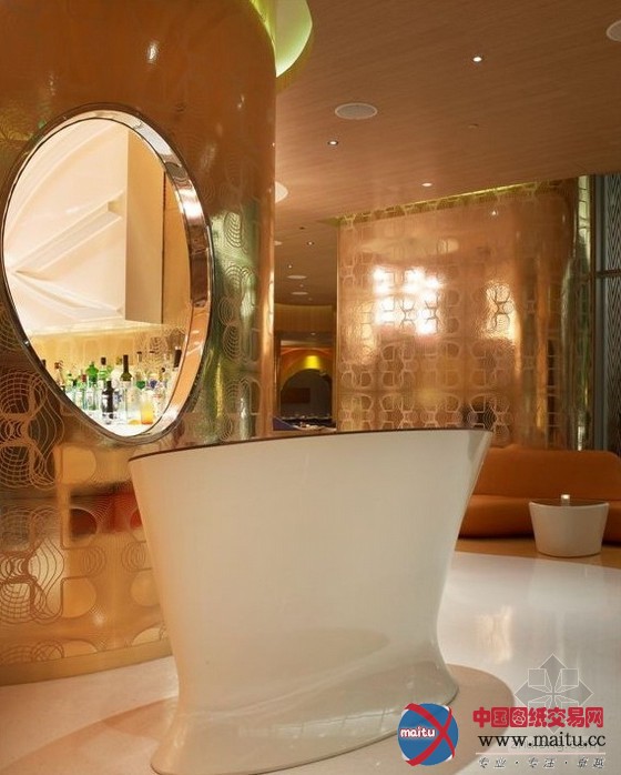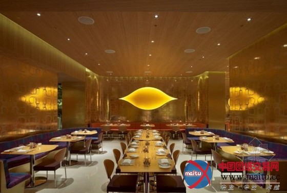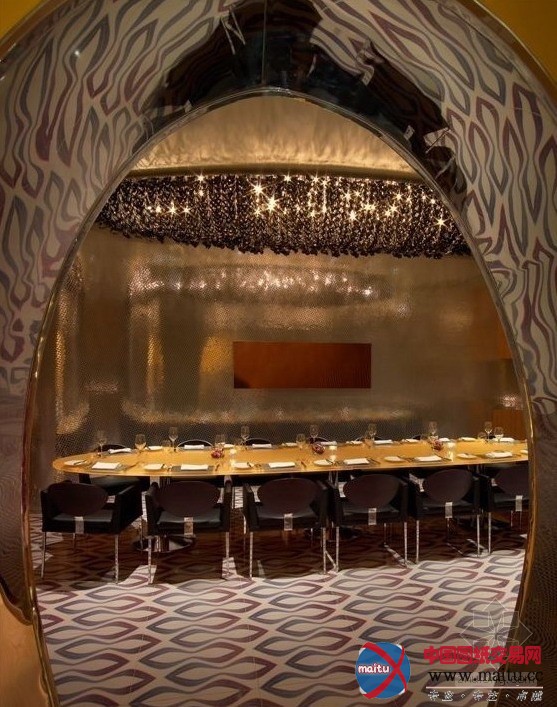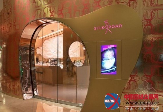 这是位于拉斯维加斯的“Vdara”旅店,计划师为这家餐厅创作发明一个私密的会所氛围,白日在天然光的照耀下,餐厅显现出世动雄厚的色采,到了晚上则又是高兴温馨的氛围。三个不合主题地区,计划了一面曲折的墙壁,创作发明出一天的不合动态结果。“丝绸之路”餐厅计划的色彩首要包含白色、粉赤色和玻璃金色、金属色,另有木制的天花板和朴实的纤维玻璃,餐厅里温馨的橙色灯光令人想起内华达州南部的戈壁和日落。
