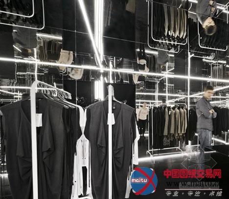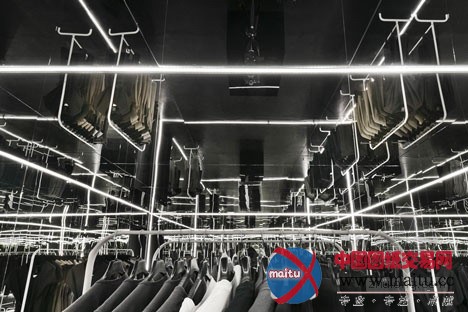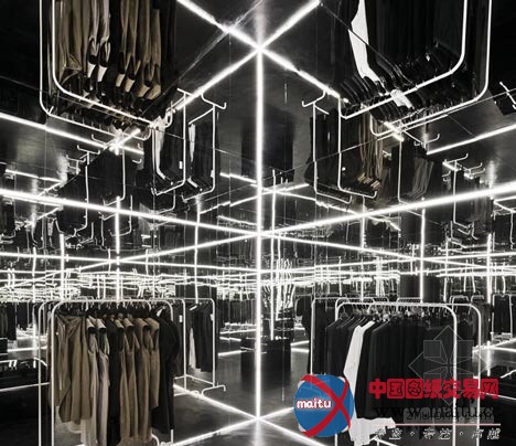 波兰修建师Super Super 与Inside/Outside互助计划了打扮零售商Zuo Corp一个移动办公室集装箱的一时展台,位于波兰华沙。从表面看过往,全部店面很小很不起眼,但是一踏进门,就仿佛置身于另外一个天下,这恰是计划师所寻求的置身于“爱丽丝梦游瑶池”的结果。环抱墙壁边缘的LED灯的长度在镜子中反射出来,看起来像是一个无限耽误的发光收集的一部门。从镜子中看过往,人与服饰都被覆盖在这个无限无尽的网内里,产生一种时空交织的梦幻之感。