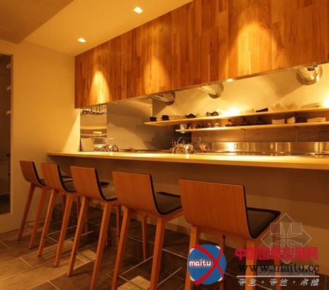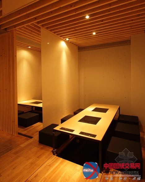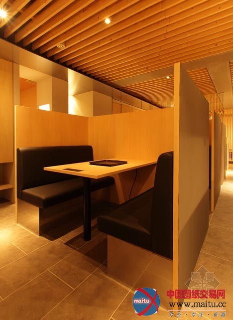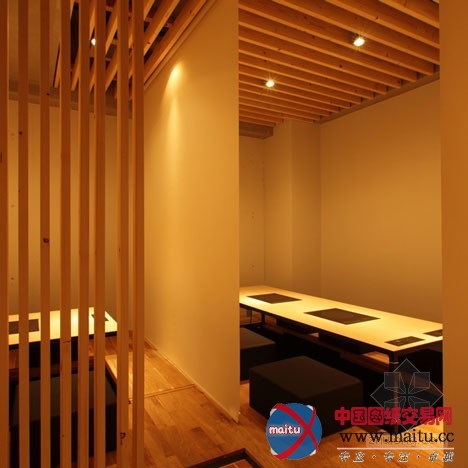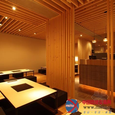 日本修建师Maker已完成了广岛的一个餐厅,其特色是木料板条从天花板上一向下垂到各个餐桌边。而这些木料板条天然构成了餐桌和过道间的屏风。