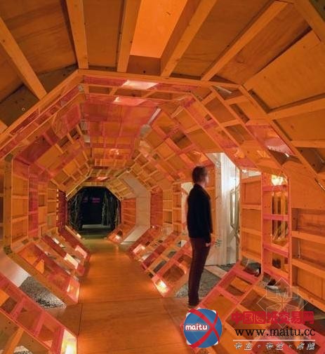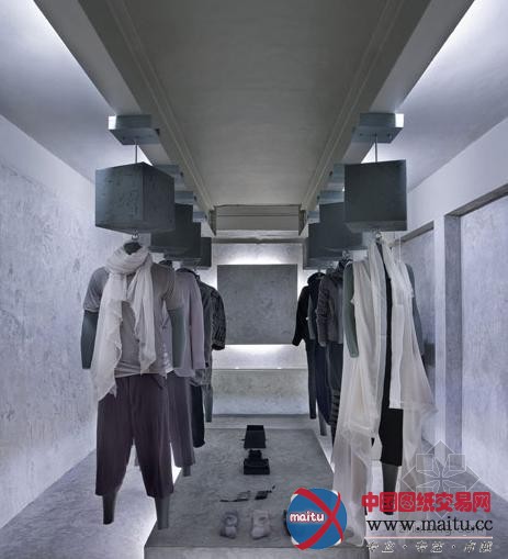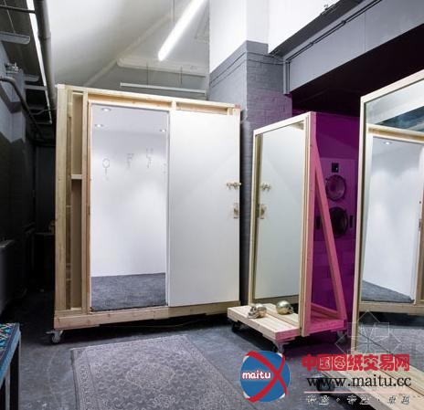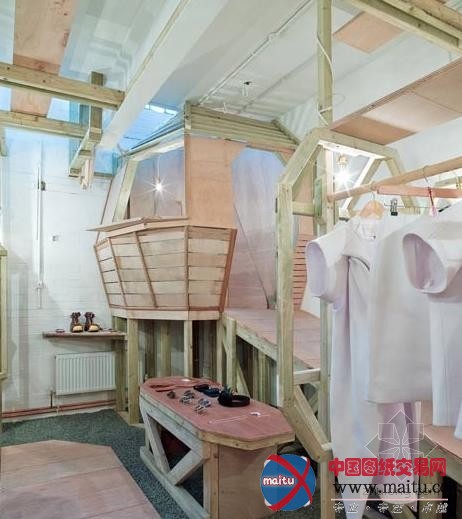 这个管道构造由原木和橙色丙烯板构成,周围被一团团的木制展现架及展现网格所围困。打扮摆设在另外一间房内白色如房子般的衣柜中,而套装则吊挂在一个个黑箱子中,箱子悬在一个阴暗的灰色调地区内。册本及音乐类产品呈列在十字形交织的木制搁架上。