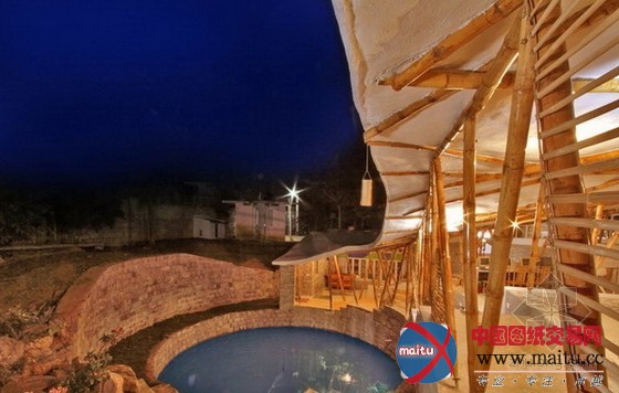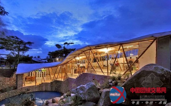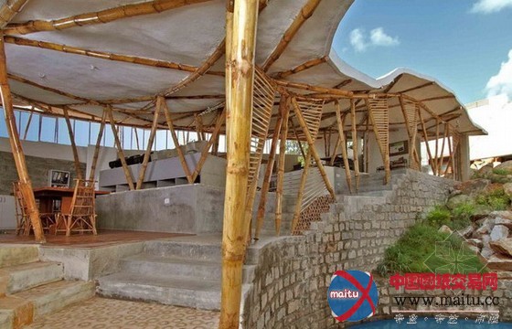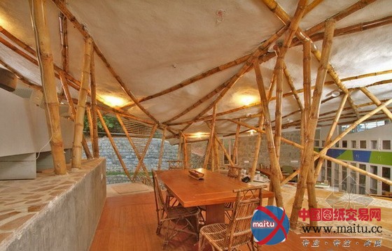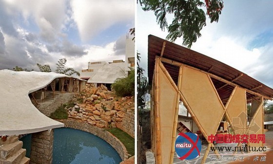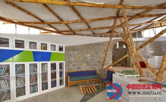修建的地基和流线形的挡土墙是由泥块堆叠而成的,这也是该地区首要的修建材料。预制混凝土屋顶笼盖着由中空的竹子做成的网格布局,它是由竹制椽子和柱子举行支持。混凝土材料当中混进了植物纤维,这使得材料更加坚毅的同时减少了修建的团体重量。其他收受领受利用来的元素还包含粉煤灰、木料、碎铁片、石块和别的噜苏材料。