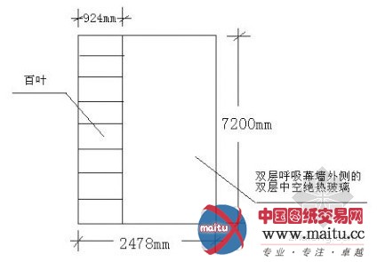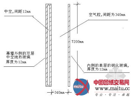 此中内呼吸式玻璃幕墙的立面采取深色铝合金饰面的框架,具有猛烈的竖向分开感。框架之间为大年夜片的玻璃,此中一小部门为罩上百叶窗帘的可开启扇,为天然通风和排烟供应了前提(见图1)。每个框架的尺寸为2478mm×7200mm,外侧为双层中空尽热玻璃,内侧为可开启的单层钢化玻璃,二者之间为氛围腔,氛围腔的宽度为340mm(见图2)。氛围腔与室内的氛围相连通,氛围腔的顶部按幕墙单位还安装有轮回通风机,举行强迫换气,保持楼内的温度和湿度恒定。