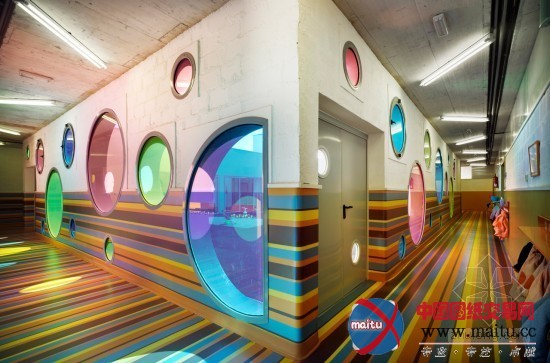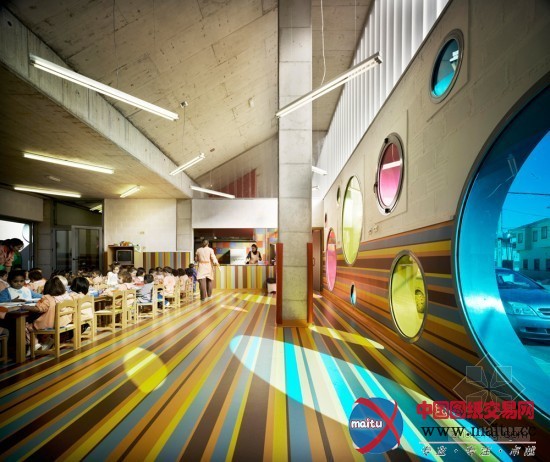巨大年夜的布局性板面(屋顶)被折叠在空间当中,构成双高的室内空间,与周围修建的天涯线相调和,增加了室内空间及采光量。这个笼盖物涵盖了全部的房间,和大年夜部门的根本举措措施(管道、通信、照明体系)。在这个巨大年夜的屋顶天幕下漫衍有三个春秋组的八间课堂,这些课堂都朝向中心操场,以便于室内与室外空间的互动。在操场的周围还计划了一间食堂、厨房和数间行政办公室。