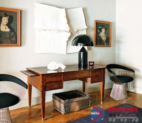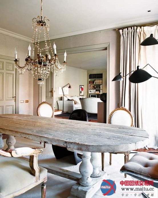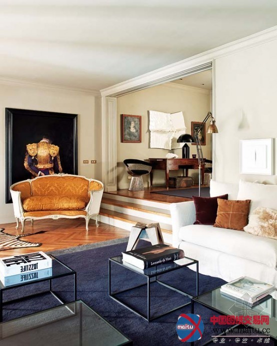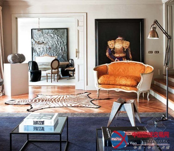 这里另有着有机的混搭气焰:客堂中传统的沙发配上南非的板凳和地板上的动物外相,书房中古典的桌子配上当代的椅子,餐厅中法度的扶手椅配上村落气焰桌子,寝室中精致的灯具和柔嫩的兽毛。