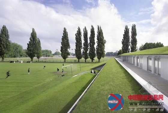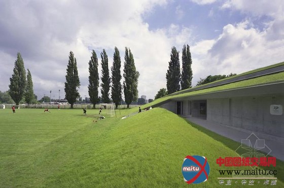 这是CHARTIER CORBASSON ARCHITECTES 事件所计划的一个足训中心,位于法国。项目分为两个部门,别离位于修建的两层上,一楼是学员宿舍,办公室;二楼是换衣室与活动大年夜厅。草皮的外衣一向耽误到修建的顶上,一层的墙面主如果釉面,以确保外部的绿化从内清晰可见。