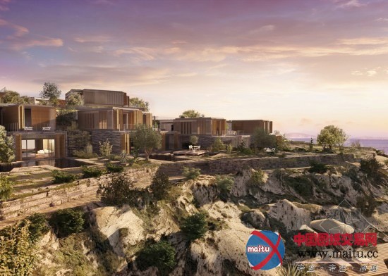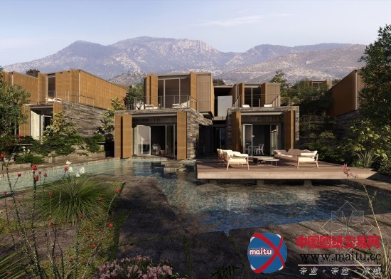 为了使修建可以或许天然的与基底岩石相调和,修建团体色彩与修建样式都举行了专门计划,色彩附近与岩石色彩。层高跟着园地犬牙交错的主机爬升,远不雅如统一片人造山岳。景不雅的计划一样基于这一点,多利用园地原本的岩石作为公寓的景不雅元素。
