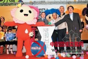 “2012花现台北——斗丽再现”,由吉祥物小点点(左起)、金传媒营运长杨大年夜德、台湾“产发局副局长”林万发、台湾地区花草发展协会常务监察人陈昭明与总经理钟国成主持起跑典礼。