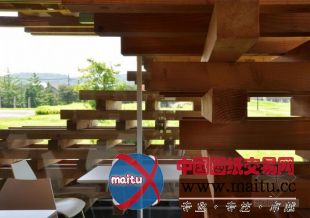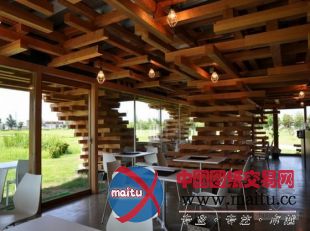 隈研吾计划的Kureon咖啡厅,位于日本富士。197平方米的空间几近是漂泊在地面之上的,室内的就餐空间被包裹在一个玻璃环抱的盒子里,室外被一个木条错层排布体系围困。咖啡厅的布局视觉上倒置,显现出屋顶上连续的层次,和下面紧凑的与基底连接的支持布局。