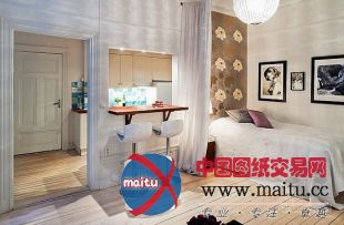 计划一个小室第是一种挑衅,特别是这里的空间只有三十四平方米大年夜,但是计划师仍然是别开生面,为人们显现出既合用又美丽的空间。巨大年夜的窗户使天然光流进室内,创作发明出一种开阔感。单人床被嵌在角落,靠墙安排,长长的窗帘可以或许为人们供应隐私。一个小小的咖啡桌和两把椅子被安排在阳台,以制作休闲的座椅区。