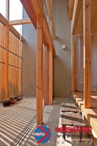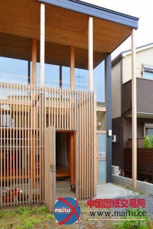Mizuishi Architect Atelier 计划的一个室第,位于日本东京。房子坐落在一个很深的院落里,主人是一对伉俪与他们的两个小孩,和两只狗与三只猫。房子较长的东西向是封锁的,而较短的南北向是开放的,并且两端都有最小的只有600mm的窄布局墙相衔接。