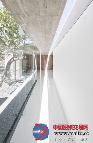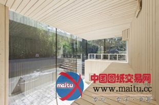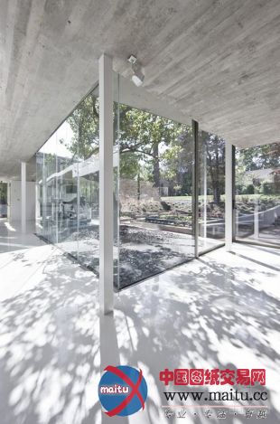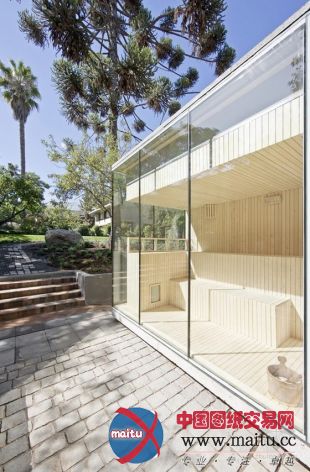一道窄窄的天光沿着走廊的天花板倾斜而下,走廊连接着桑拿房与热浴泡池房和一间安插好的起居室。风趣的是桑拿房安插在这座玻璃屋的最北侧,完整的透明玻璃窗让享受桑拿的人可以将表面的风景一览无余,相反他们也几近成了橱窗中的展品一样被人看到。